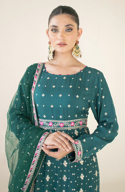 This soft-toned 3-piece set features a sage green printed shirt adorned with a subtle mix of floral and botanical motifs in hues of rust, beige, and charcoal. The neckline and sleeve cuffs are highlighted with contrasting rust-orange piping and intricate embroidered borders. It is paired with a matching green trouser featuring a decorative hem and a cream-toned dupatta printed with traditional patterns for a rich, cultural finish.